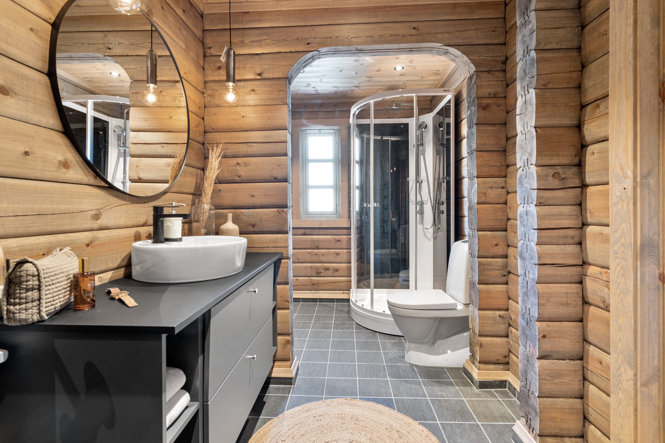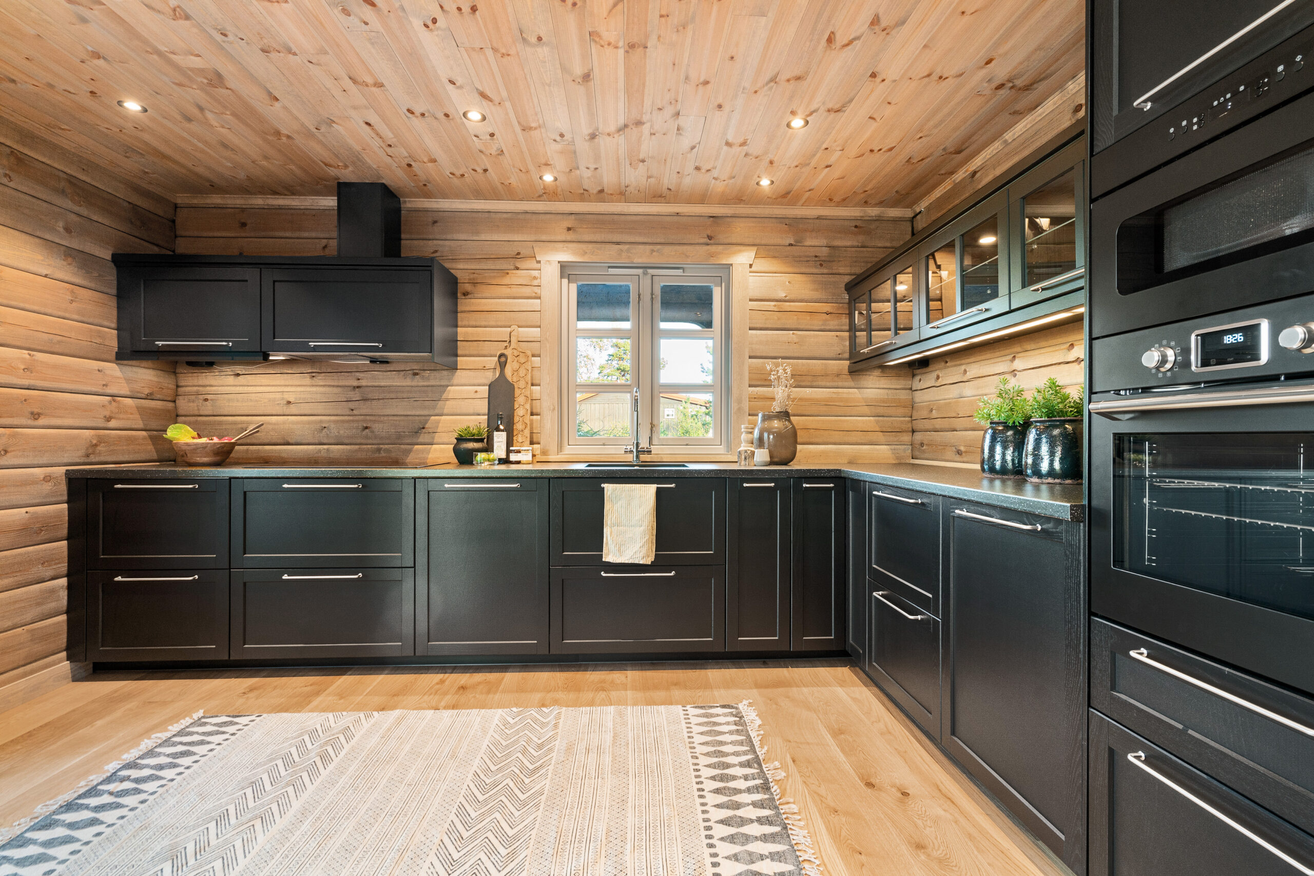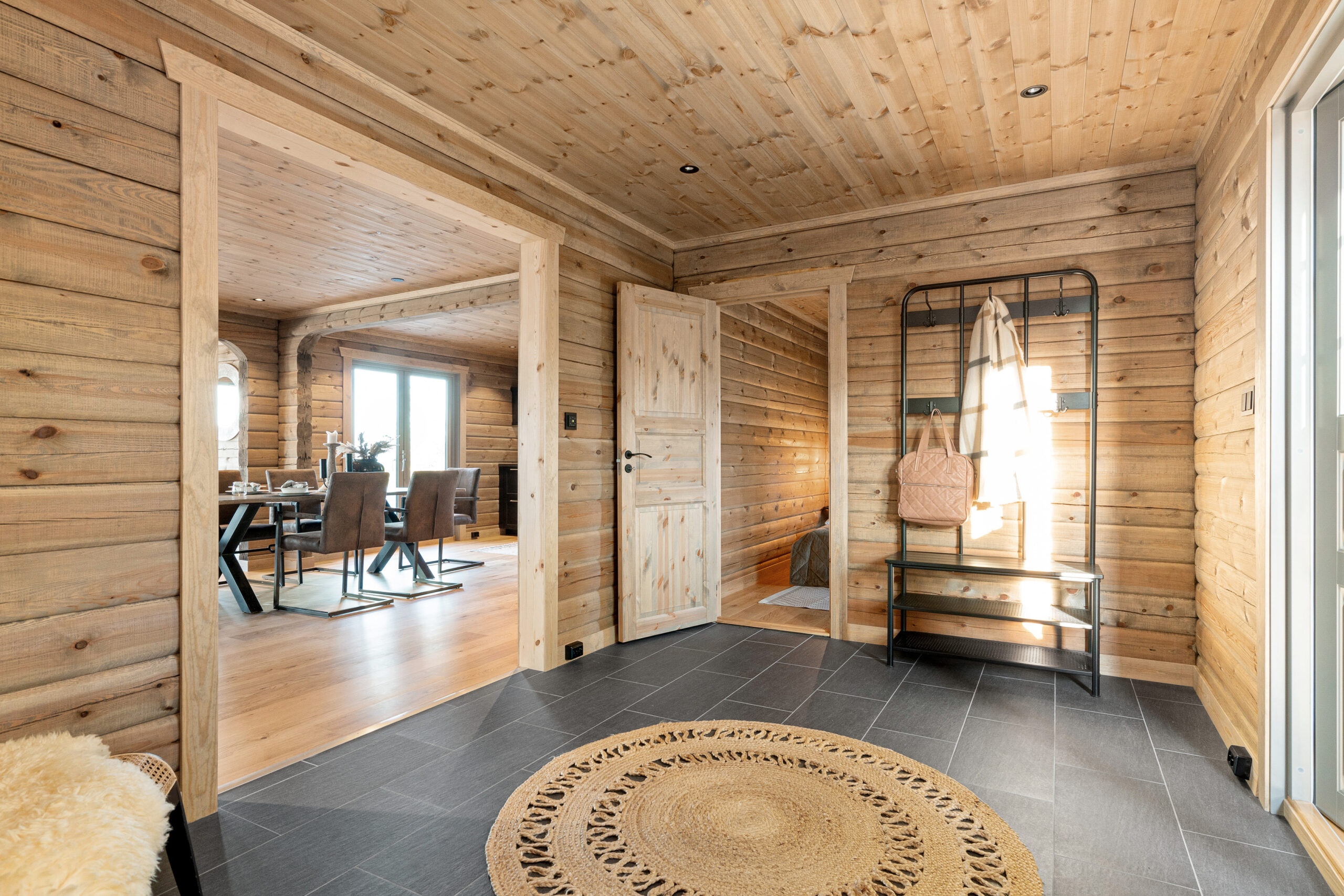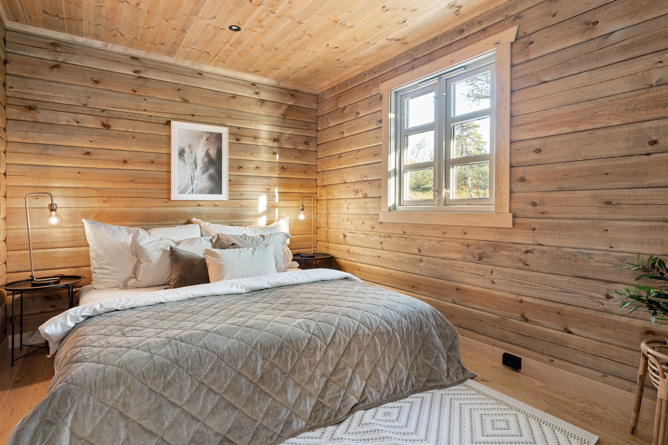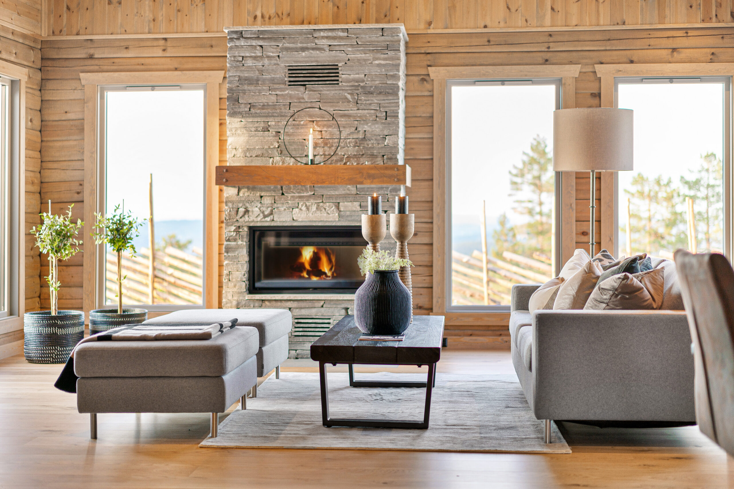Hytta har en åpen kjøkken- og stueløsning med utbygg og full takhøyde, synlige åser og store, moderne vindusflater som slipper naturen inn og gir fantastisk lys og utsikt. Her er det god plass til stor peis, langbord og felleskap – selve hjertet i hytta.